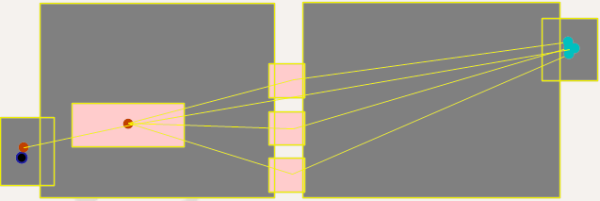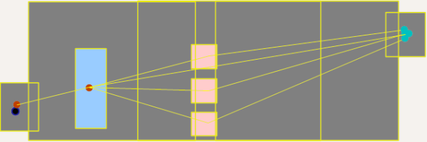Modellierung einer gemeinsamen Warteschlange für die Abfertigung in der Reihenfolge des Eintreffens an mehreren Schaltern. In der Realität wird dieses Prinzip „First come – first served” oft in Postämtern und in Bahnhöfen oder Flughäfen praktiziert. Die Fußgänger warten nicht erst in Warteschlangen an den Schaltern, sondern bereits vorher auf einer Fläche. Das Attribut Warteschlange der Fläche, auf der die Teilroutenentscheidung liegt, muss ausgewählt sein. Die Fläche wird damit zu einer Warteschlangenfläche.