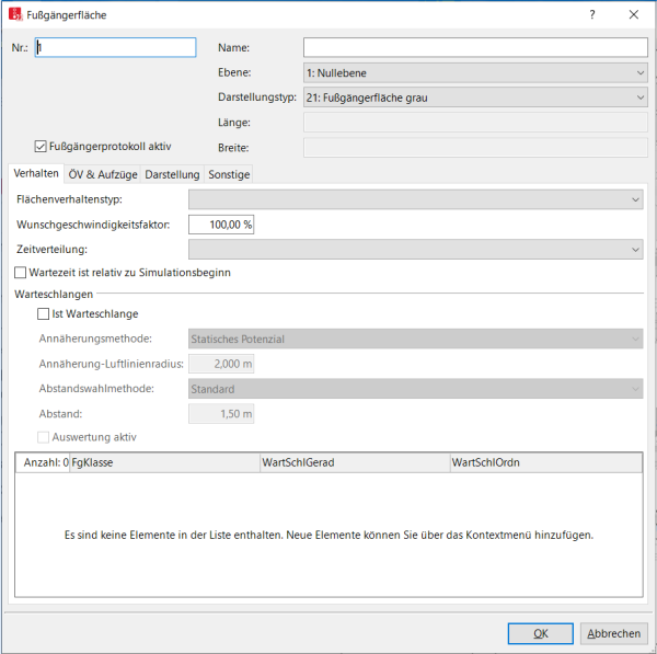 Fußgängerprotokoll aktiv (FgProtAkt): Ist die Option ausgewählt, werden die Fußgänger auf dieser Fläche im Fußgängerprotokoll berücksichtigt (Fußgängerprotokoll in Datei oder Datenbank speichern). |