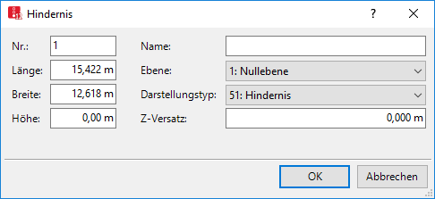 Das Fenster Hindernis öffnet sich, wenn Sie ein Hindernis einfügen und das automatische Öffnen des Bearbeiten-Dialogs nach Objekterstellung ausgewählt ist (Rechtsklick-Verhalten und Aktion nach Objekterstellung definieren).