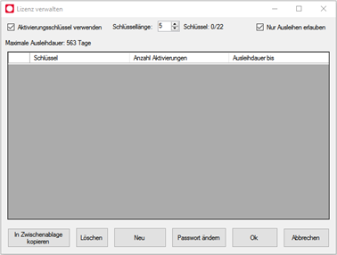 Ist die Option ausgewählt, wird für die Ausleihe einer Lizenz ein Aktivierungsschlüssel benötigt.