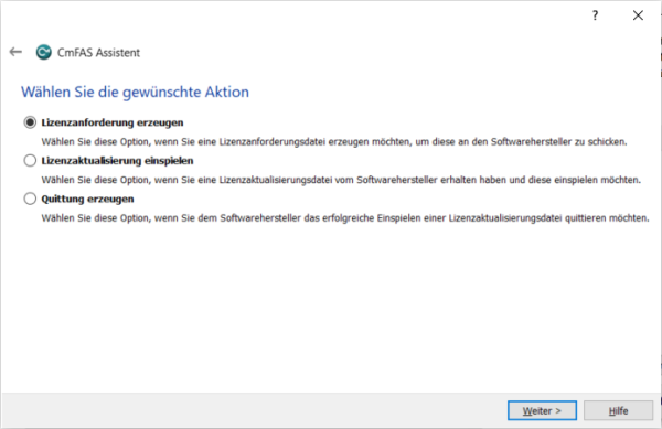 5. Fahren Sie fort mit Lizenzanforderungsdatei erstellen Schritt (Markieren Sie auf dem Register Lizenz den gewünschten Lizenzcontainer.).