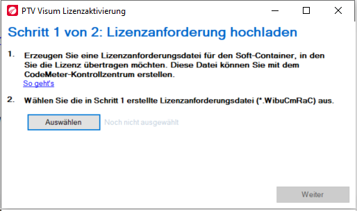 3. Übertragen Sie die erstellte Lizenzanforderungsdatei vom Computer mit Internetverbindung auf den Server der PTV (Lizenzanforderungsdatei hochladen ).
