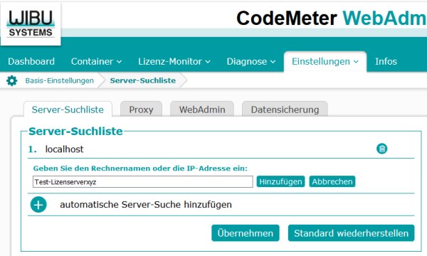 5. Geben Sie im Register Server-Suchliste den Computernamen oder die IP-Adresse des gewünschten Lizenzservers ein.