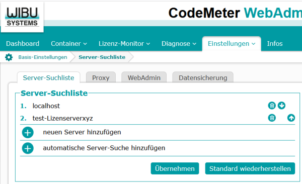 Der Lizenzserver wird in die Server-Suchliste übernommen und wird im Fenster Lizenzverwaltung im Bereich Codemeter-Serverumgebung angezeigt.