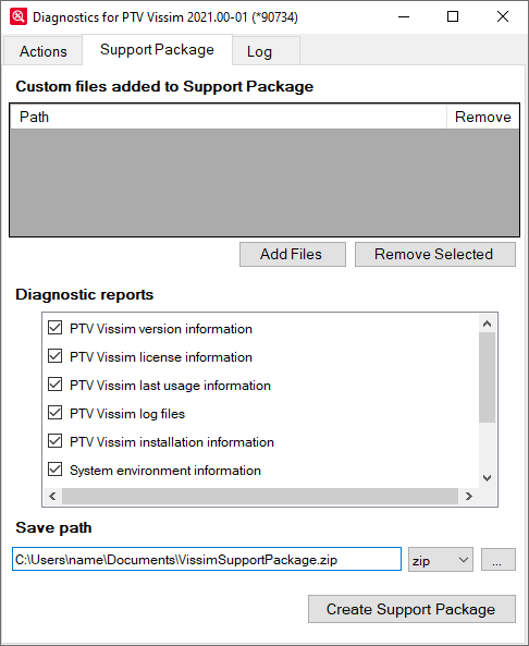 In the Support package tab, you can combine all desired data for PTV Vision Support into a support package, save it to a *.zip file and send it to PTV Vision Support.