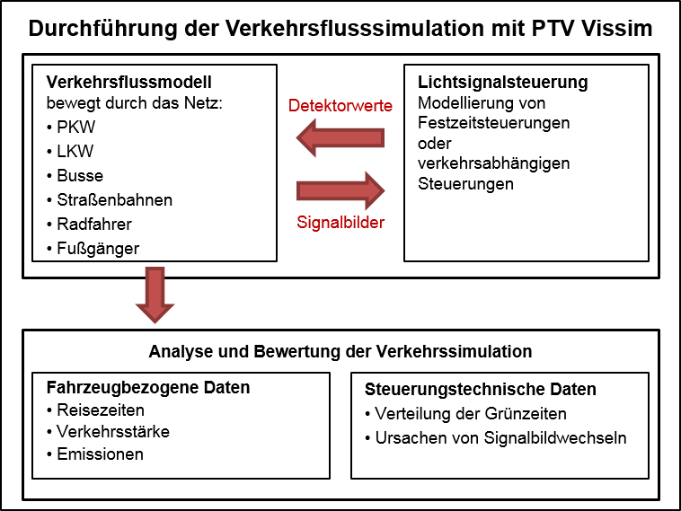 Vissim basiert auf einem Verkehrsflussmodell und der Lichtsignalsteuerung. Diese tauschen Detektormesswerte und Signalisierungszustände aus.