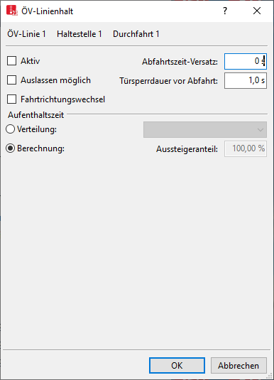 Das Fenster ÖV-Linienhalt öffnet sich und zeigt abhängig vom Netzobjekt, auf das sich der ÖV-Linienhalt bezieht, unterschiedliche Attribute an: