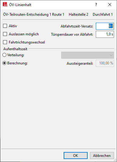 Abfahrtszeit-Versatz: Abfahrtszeit gemäß Fahrplan definieren. Der Zeitversatz wird zusätzlich zur Fahrgastwechsel-Zeit (Einsteigen/Aussteigen) verwendet. Die resultierende Abfahrtszeit ergibt sich aus: Simulationssekunde der Ankunft + Aufenthaltszeit + max (0, ((Abfahrtszeit der ÖV-Linie + Abfahrtszeit-Versatz) - (Simulationssekunde der Ankunft + Aufenthaltszeit)) • Fahrplantreue der ÖV-Linie) Ist die fahrplangemäße Abfahrtszeit später als der Zeitpunkt, der sich als Summe von Ankunftszeit und Aufenthaltszeit ergibt, wartet das ÖV-Fahrzeug bis zur fahrplangemäßen Abfahrtszeit, wenn die Fahrplantreue 1 beträgt. Bei einer Fahrplantreue < 1 fährt das Fahrzeug entsprechend früher los, Wertebereich 0.00 bis 1.00. Beträgt die Fahrplantreue der Linie 0.00 wird der Fahrplan nicht berücksichtigt. Dann werden für die Ermittlung der Aufenthaltszeit die Einstellungen im Bereich Aufenthaltszeit berücksichtigt. Der Fahrplan wird berücksichtigt, wenn das Attribut Zeitversatz der ÖV-Linie > 1 ist. Für Linienhalte in ÖV-Teilrouten gilt: