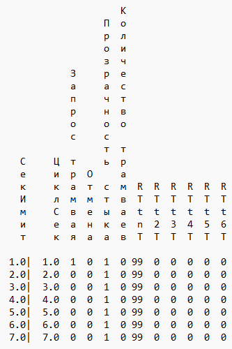 Если во вкладке Прямой вывод выбран протокол ССУ/детекторов, и завершена имитация или тест, то файл *.ldp содержит следующие данные. Протокол детекторов ССУ имеет табличную форму с одной строкой на каждую секунду имитации и столбцом на выбранный тип значений. В каждой строке протокола может отображаться от 1 000 до 3 000 знаков.