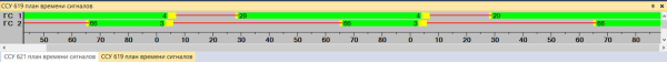 Можно в окне показывать актуальные виды сигналов и состояния детекторов во время имитации или во время интерактивных тестов логики регулирования светосигнальных установок. Там для каждой выбранного ССУ графически вдоль горизонтальной оси времени отображаются время зеленого сигнала, время желтого сигнала и время красного сигнала.