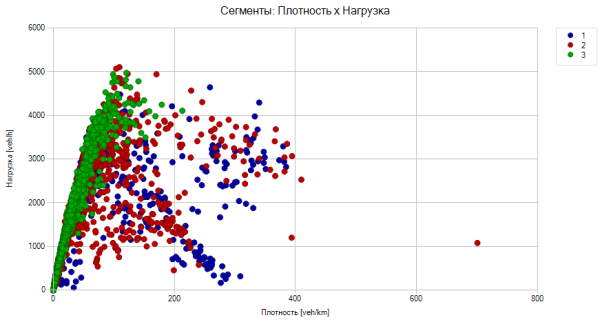 На изображении показан, например, параметр Плотность (Density (All)) в зависимости от параметра Нагрузка (Volume (All)), исходя из анализа отрезков на базе сегментов анализа отрезка. Сравнение результатов трех циклов имитации обеспечивает возможность записи циклов имитации для последовательности данных. Vissim автоматически присваивает точкам каждой группы ряда данных один и тот же цвет.