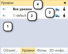 Рекомендация: По умолчанию панель объектов сети, панель уровней, панель 3D-инфо-досок и панель фонов расположены вместе. Таким образом, с помощью вкладок под панелью можно переключаться в ту или иную панель. |