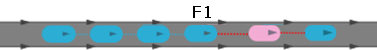 Чтобы транспортное средство (FF) могло безопасно выехать из автоколонны, Vissim увеличивает расстояние позади транспортного средства до позади идущего ТС (F1) в автоколонне, до тех пор пока не будет достигнута дистанция безопасности. Если транспортное средство является в автоколонне позади идущим, а не ведущим транспортным средством, Vissim также увеличивает расстояние до едущего впереди в автоколонне транспортного средства (F).