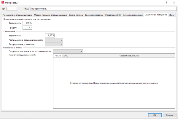 2. Выберите свободное распределение в области Ошибочный анализ в атрибуте Распределение ошибочной оценки скорости, которое должно использоваться по умолчанию для транспортных средств с соответствующей манерой езды.