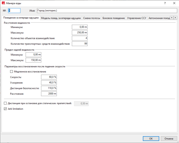 Минимум, Максимум: минимальное и максимальное расстояние предела задней видимости транспортного средства, чтобы реагировать на транспортные средства вверх по направлению движения. Предел задней видимости влияет в ТС только на восприятие других транспортных средств; транспортное средство не распознает другие объекты взаимодействия. Количество объектов взаимодействия в параметре Предел задней видимости учитывается только при расчете бокового поведения ТС. Во всех остальных случаях для предела задней видимости транспортное средство распознает не более одного другого транспортного средства. Влияние минимального предела задней видимости на боковое поведение Если в пределах полосы движения возможен обгон, то введите значение больше 0,00, например внутри города 20–30 м, вне населенных пунктов, соответственно, большие значения. Это позволяет избежать ситуации, когда транспортные средства проезжают сквозь друг друга, если перед стоп-линией на одном и том же отрезке намереваются перестроиться больше транспортных средств, чем указано в атрибуте Количество объектов взаимодействия. Это действительно прежде всего для вело- и мототранспорта. Максимальный предел задней видимости можно уменьшить, например, в густых сетях с большим количеством соединяющих отрезков, расположенных на незначительном расстоянии друг от друга. Это может положительно повлиять на скорость имитации. |