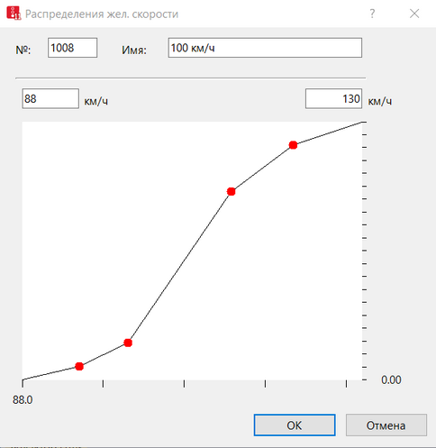 Откроется окно <Имя> распределение. Пример распределения нужной скорости с тремя опорными точками в ходе кривой.