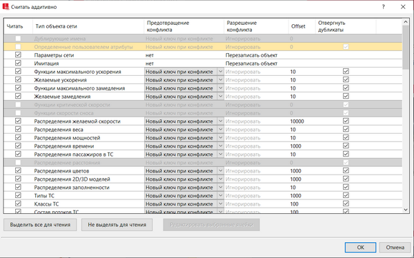 При аддитивном считывании часто не должны дублироваться те объекты, которые идентичны в обоих файлах сети. Прежде всего это касается объектов базовых данных, к примеру, типов ТС.