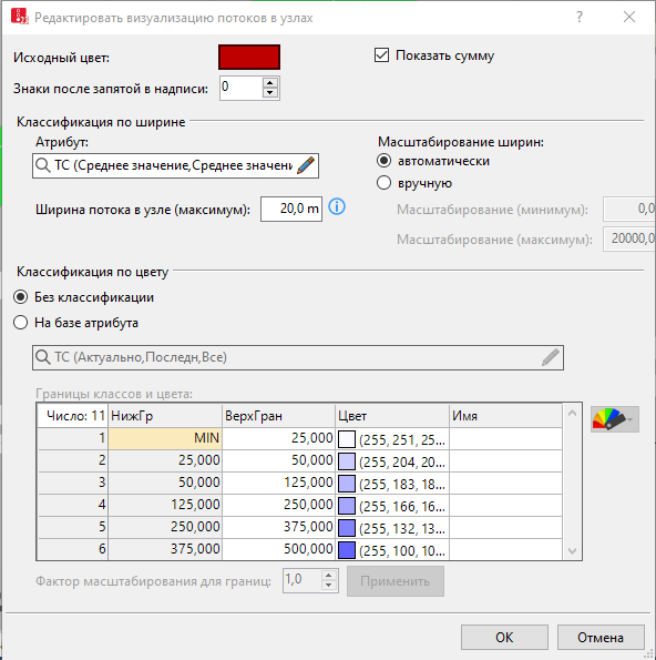 Показывает сумму значений атрибута, выбранного для параметра Классификация по ширине, в начале и в конце каждой корреспонденции. Для отображения в Vissim численных значений атрибутов и суммарных значений элементы интерфейса программы должны иметь достаточно большой размер (Визуализировать потоки в узлах). |