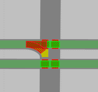 - Если конфликтная зона содержится более чем в двух поворотах и Vissim вычисляет для них различные статусы, то Vissim устанавливает статус на Пасс. К конфликтной зоне перекрестка относится также следующее: если один из двух сегментов отрезка в конфликтной зоне находится на главном потоке, то отрезок этого сегмента получает приоритет (зеленый).