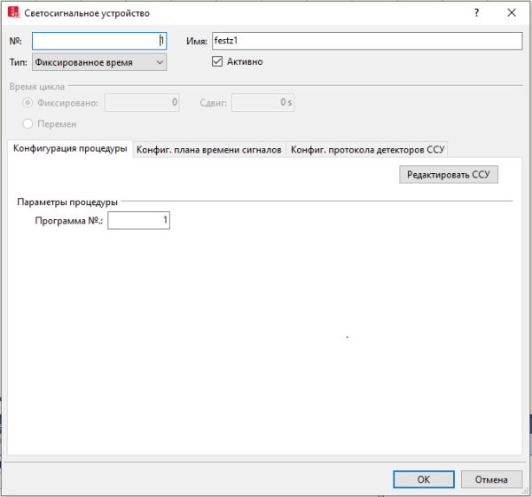 Откроется редактор сигнальной программы (Открыть и применить редактор ССУ). Группы сигналов необходимо создавать и удалять в редакторе ССУ. Изменения номера канала существующих групп сигналов распознаются в Vissim и оптимизируются в относящихся к ним светофорах.