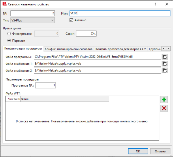 Для каждого ССУ необходимо выбрать в Vissim файлы снабжения *.vce или *.PW1 для системы управления VS-PLUS. Эти файлы можно создавать с помощью интерфейса проектирования и снабжения visual VS-PLUS.