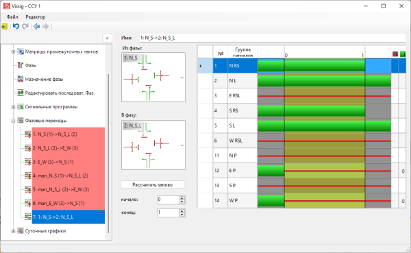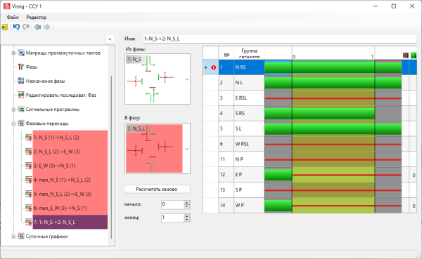 - Если состояние группы сигналов изменяется на Разрешено или Закрыто, относящиеся к ней фазовые переходы, как правило, останутся неконсистентными. В таком случае в дереве навигатора неконсистентные фазовые переходы выделяются красным цветом. На рисунке в фазе 2 для S RG состояние с Закрыто изменилось на Разрешено.