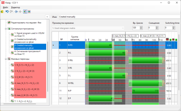 - Если добавлены дополнительные конфликты, это может привести к недействительным фазам. В области Назначение фазы конфликтный зеленый сигнал отмечается при помощи красных ячеек.