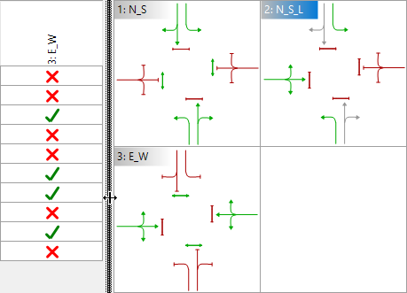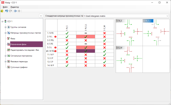 Если матрица промежуточных тактов выбрана в качестве стандартной, при создании фаз проводится проверка конфликтов (конфликтующие потоки). При допуске конфликтных групп сигналов в той же фазе они отображаются в таблице красным.