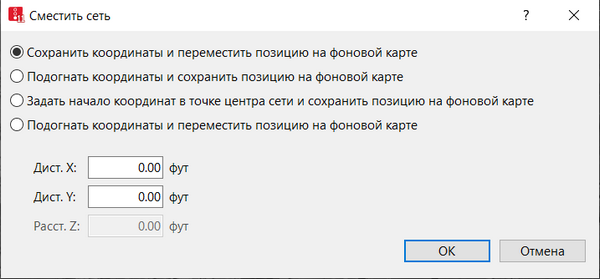 Соответствует функции позиционирования сети Vissim на фоновой карте (Разместить сеть Vissim на фоновой карте). Выбирайте эту опцию, например, если сеть неверно располагается на фоновой карте. Расст. Z невозможно изменить. |