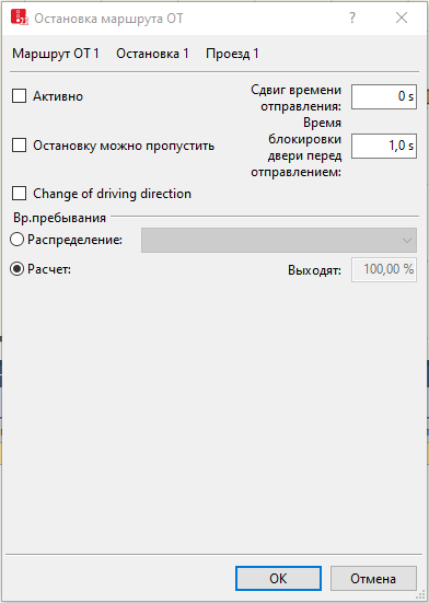 Сдвиг времени отправления: определение времени отправления согласно расписанию. Временной сдвиг используется в дополнение к времени высадки и посадки пассажиров: Итоговое время отправления выводится из: Секунда имитации прибытия + время пребывания + макс. (0, ((время отправления маршрута ОТ + сдвиг времени отправления) – (секунда имитации прибытия + время пребывания)) • по расписанию маршрута) Если время отправления по расписанию позже, чем момент времени, который выводится как сумма времени прибытия и времени пребывания, то транспортное средство ОТ ожидает времени отправления по расписанию, если показатель По расписанию составляет 1. При показателе По расписанию < 1 транспортное средство отъезжает соответственно раньше, диапазон значений 0.00 до 1.00. Если точность По расписанию маршрута составляет 0,00, то расписание не учитывается. Тогда для определения времени пребывания учитываются настройки, выбранные в области Время пребывания. Расписание учитывается, если атрибут Временной сдвиг маршрута ОТ > 1. Для остановок маршрута в частичных маршрутах ОТ действительно: