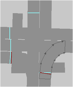 . Если эта опция выбрана, то знак «Стоп» должен быть размещен на соединяющем отрезке для поворачивающих направо потоков. Тем самым знак Стоп будет виден только для поворачивающих транспортных средств. Светофор размещается на той же самой позиции, однако лучше на отрезке, чем на соединяющем отрезке. Светофор регулирует транспортное движение в направлении прямо.