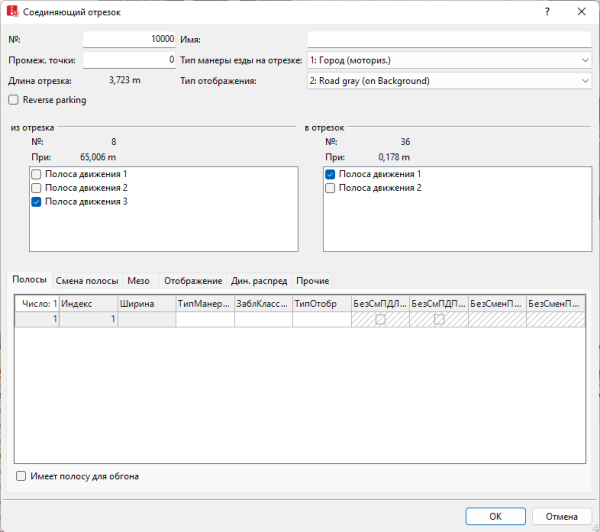 Полоса исходящего отрезка (ИзОтр) на полосу движения следующего отрезка (ВОтр), между которыми вставляется соединяющий отрезок. Всегда выбирайте в обоих списках идентичное количество полос движения. Впоследствии это можно отредактировать. |