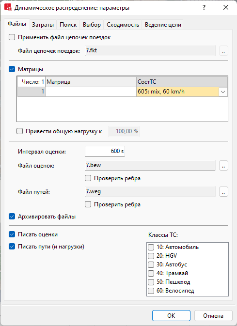 Интервал времени, через который рассчитываются затраты и ведется поиск путей. В пределах этих интервалов может изменяться выбор путей транспортных средств. Может быть изменено до создания файла *.bew (Продолжительность интервалов оценки для определения времени в пути). |