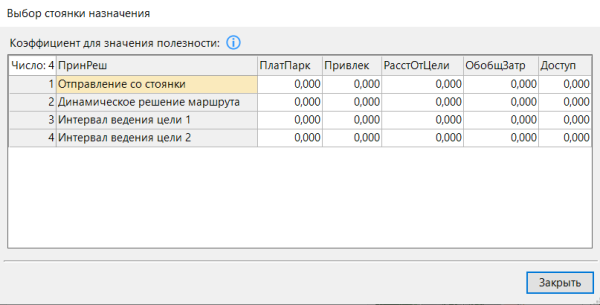 | Нижняя граница Logit | Если вероятность выбора автостоянки ниже данного значения, то автостоянка не выбирается в качестве стоянки назначения. В результате этого повышаются вероятности выбора оставшихся стоянок. |