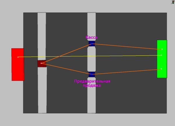 В случае имитации, например, билетных касс проблема заключается в том, что пешеходы чаще всего используют кратчайший путь. Они не рассматривают никаких путей в обход, чтобы сэкономить время. Даже в тех случаях, когда обход минимален, как при наличии нескольких касс. Если пешеходы приближаются к ряду касс не ортогонально, они могут создать очередь у одной или двух касс и игнорировать каждый дополнительный пропускной шлагбаум. Это было бы нереально. Используйте для этого динамические решения частичных маршрутов.