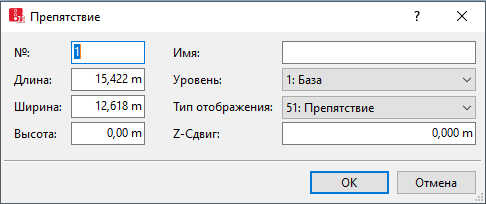 Окно Препятствие откроется, если вставлено препятствие и выбрано автоматическое открытие диалогового окна редактирования после создания объекта (Определить функцию правой кнопки мыши и действие после создания объекта).