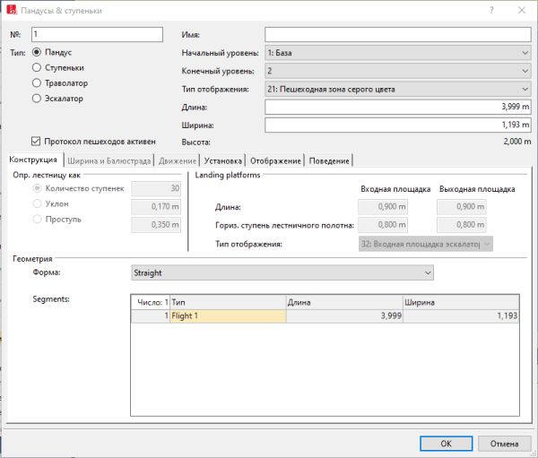 Окно Пандусы & ступеньки откроется, если вставлены пандус, ступеньки, траволатор или эскалатор и выбрано автоматическое открытие диалогового окна редактирования после создания объекта (Определить функцию правой кнопки мыши и действие после создания объекта).