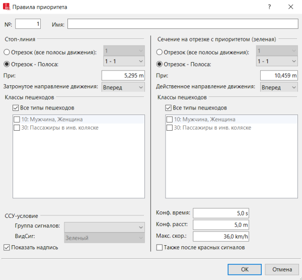 Для этих комбинаций в зависимости от атрибута отрезка Является пешеходной зоной можно выбрать классы транспортных средств и классы пешеходов для сечения на отрезке с приоритетом и сечения на уступающем отрезке.