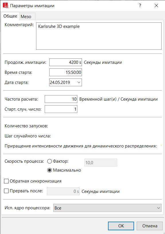 Количество ядер процессора, которые используются во время имитации. Максимальное количество зависит от компьютера. Выбранное значение будет сохранено при следующем запуске имитации. Значение по умолчанию: Применить все ядра. Выбранное количество ядер процессора сохраняется в файле сети *.inpx. Во время цикла имитации настройку изменить нельзя.