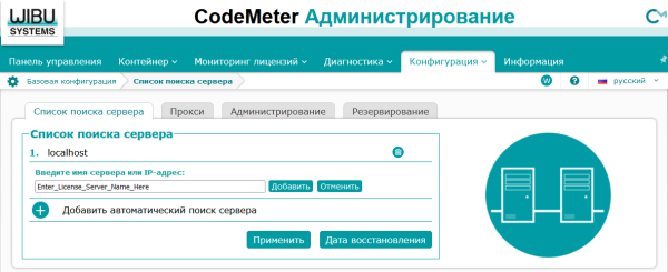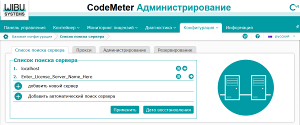 Сервер лицензий будет добавлен в список для поиска серверов и отобразится в окне Управление лицензиями, в поле Окружение сервера CodeMeter.