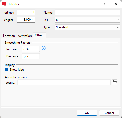 SoundFile: Wavetable sound file *.wav, which is played each time a vehicle is detected by the detector. This file is saved in the same directory as the network file *.inpx. A sound card or suitable Microsoft Windows driver must be installed.