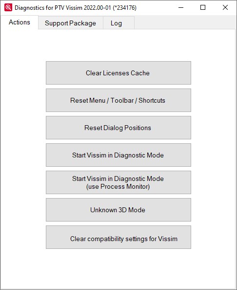 ウィンドウ[Diagnostics for Vissim2023]‐[Vissim2023の診断]が開きます。[Actions]‐[アクション] タブがデフォルトで表示されます。