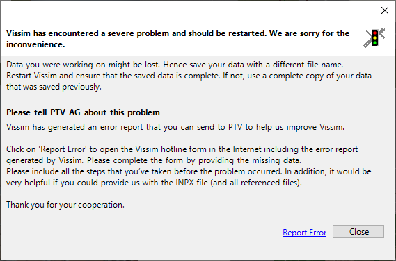 メニューの [Help]‐[ヘルプ] > [Technical Support]‐[テクニカルサポート] またはインターネットのページ、テクニカルサポートPTV VissimまたはテクニカルサポートPTV Viswalkから連絡フォームを呼び出した場合、エラーレポートは自動的に入力されません。