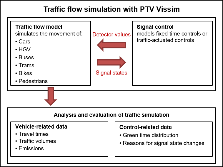 Vissimは、交通流モデルと信号制御をベースとしています。これらは、感知器の読み取り値と信号設定のステータスを交換します。