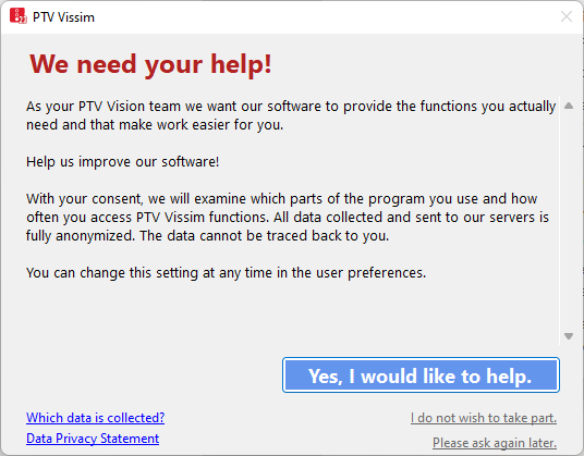 Vissimを3回目に起動したときに、[We need your help!]‐[ご協力をお願いいたします!] ウィンドウPTV Vissimが開きます。