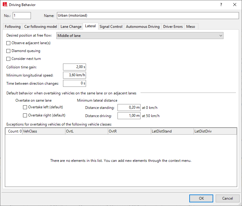 同一車線または隣の車線の車両を追い越すときのデフォルト挙動から逸脱している、特定の車両クラスの挙動。車線境界線のない交通をモデリングする際に、車線内でこの運転挙動セットの車両によって追い越される可能性がある車両クラスを選択できます。 1. リスト内を右クリックします。 2. ショートカットメニューで、[Add]-[追加] をクリックします。 デフォルトデータが入った新しい行が挿入されます。 3. 必要な変更を加えます。