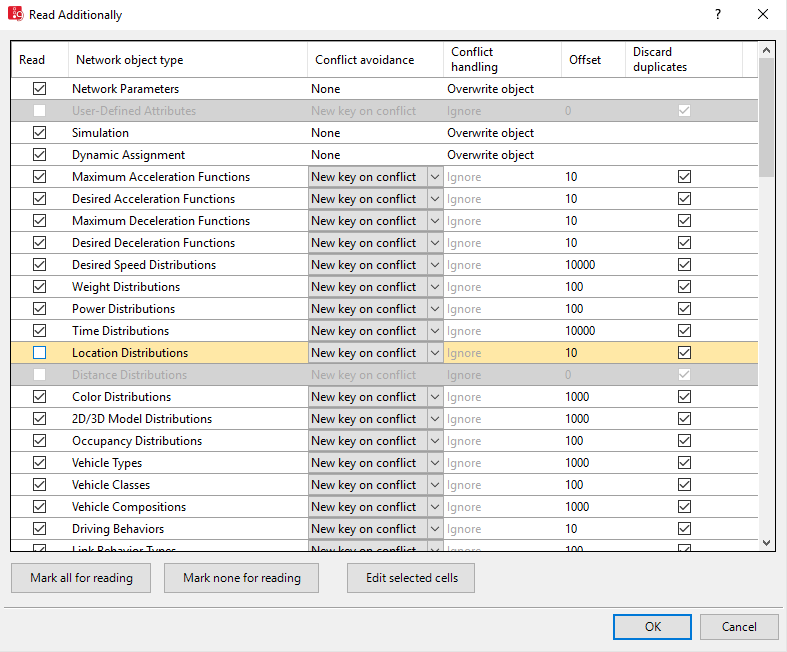 追加データの読み込み時には、通常は両方のネットワークファイルで同一となるようなオブジェクトの重複は望ましくありません。車両タイプなどのベースデータオブジェクトの場合には、この点が特に重要です。