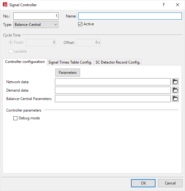 [Parameters]-[パラメータ] ボタン | [Balance-Central]-[バランス-中央] パラメータの表示。パラメータを変更し、Balance.iniファイルに保存できます。変更後は、ファイルをデフォルトのディレクトリ ..\Users\Public\Public Documents\PTV Vision\PTV Vissim 、または自分で選んだ別のディレクトリに保存できます。 |