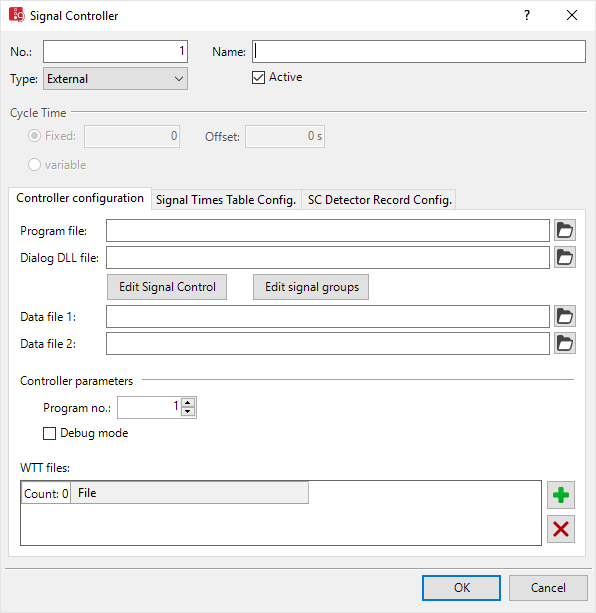 ProgNo([Program number]-[プログラム番号]):シミュレーションする信号プログラム。信号プログラム番号を、タイプ [External]-[外部] の信号コントローラーに指定できます。シミュレーション実行中にも指定できます。 |