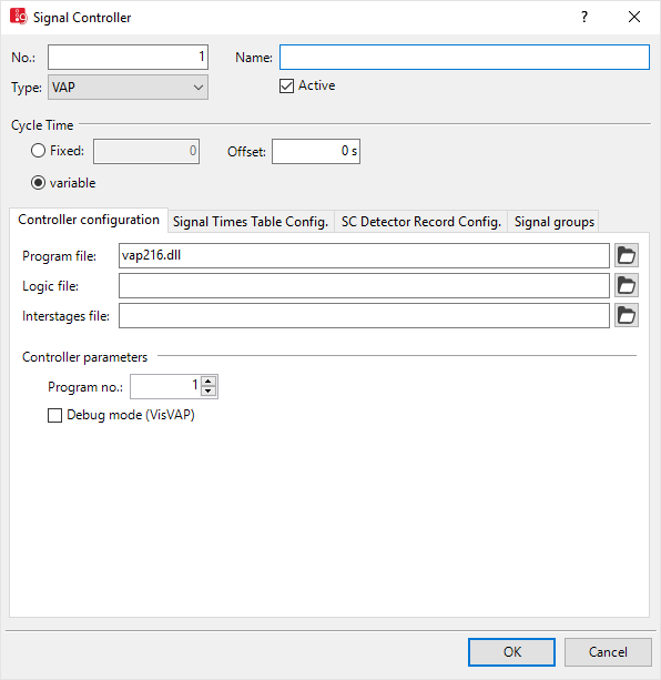 [Program no.]-[プログラム番号] | ProgNo:シミュレーションされる信号プログラム。シミュレーションの実行がコシングルステップモードの場合は、プログラムの変更が可能です。[OK] で新しい信号プログラム番号を確定すると、次のシミュレーション秒で切り替えがトリガーされます。 |